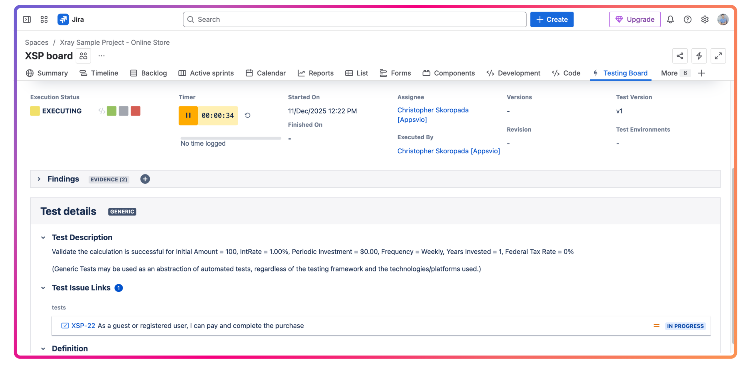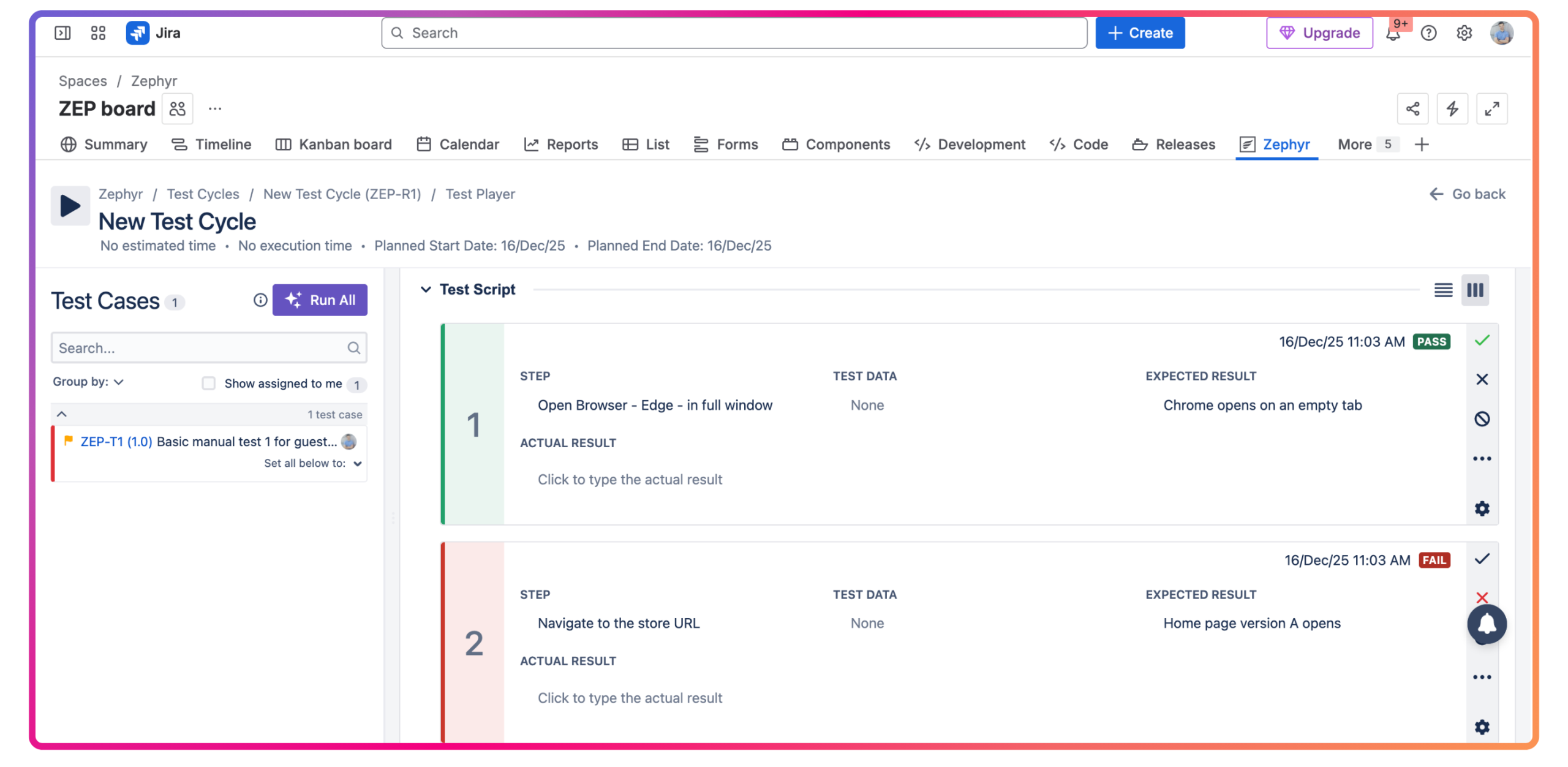 - Creation of test cases with grouping into test cycles and linking to Jira issues.