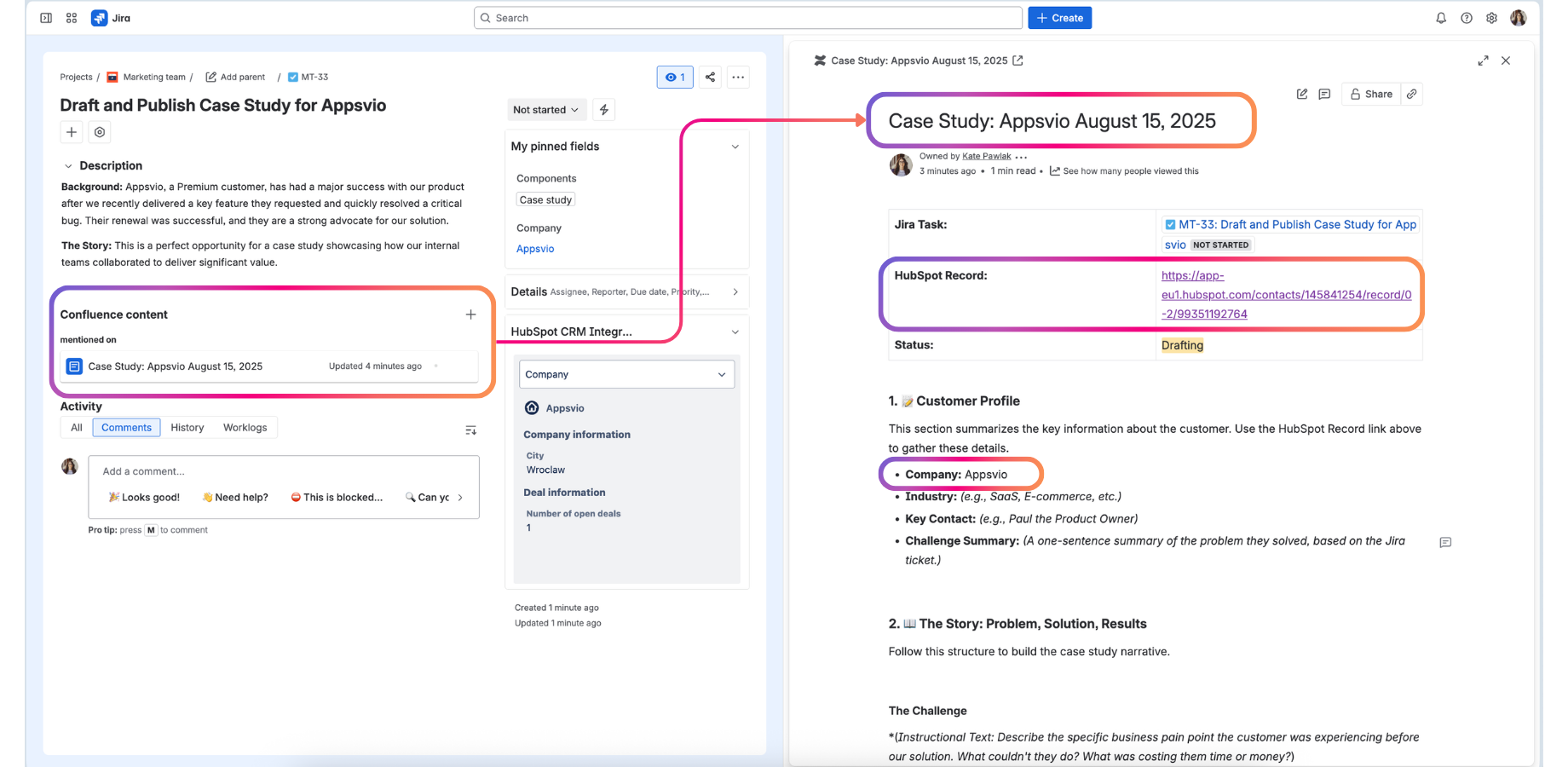 Closing the loop with automation. A Jira marketing task is linked to a Confluence page, where the case study title and HubSpot URL are automatically populated to kickstart the content creation process.