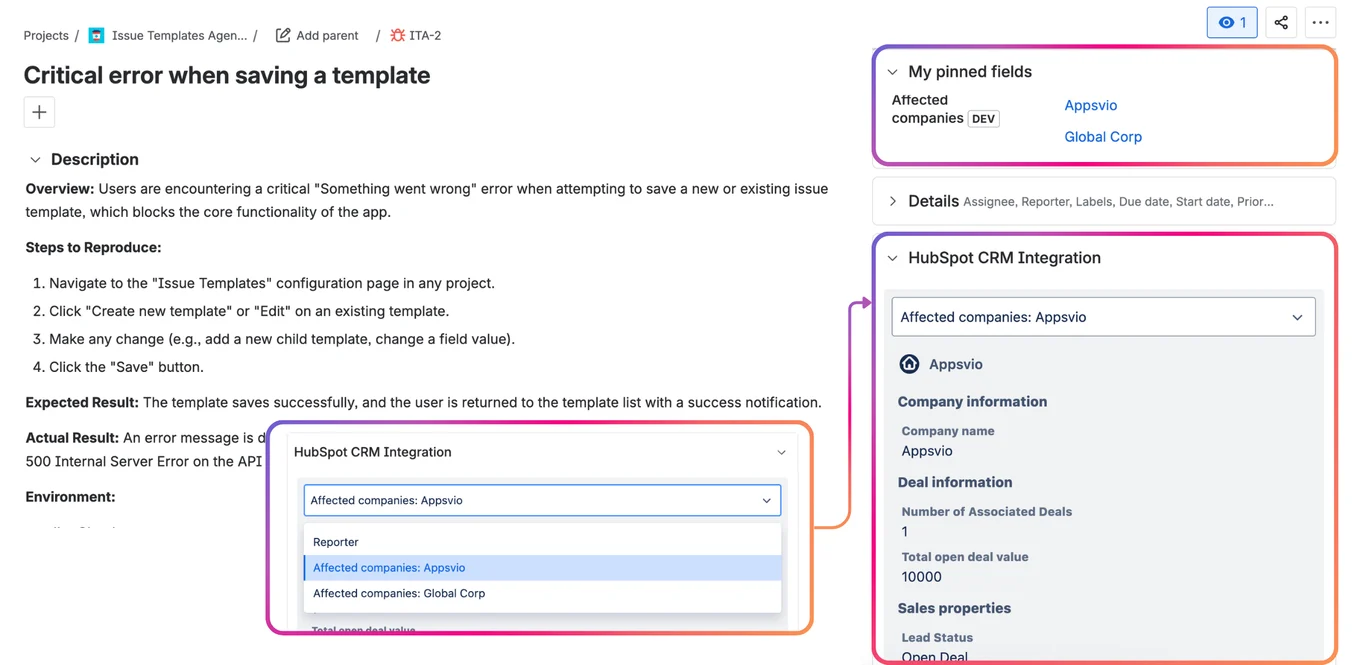 Next, the challenge is ensuring developers understand the “why” behind their work. To truly integrate your CRM with the development workflow, the customer context must follow the task. This workflow connects HubSpot directly to Jira Software, ensuring that whether it’s a planned feature or an urgent bug, a dedicated “Affected companies” field is populated with customer data and can even track multiple affected customers on a single work item.