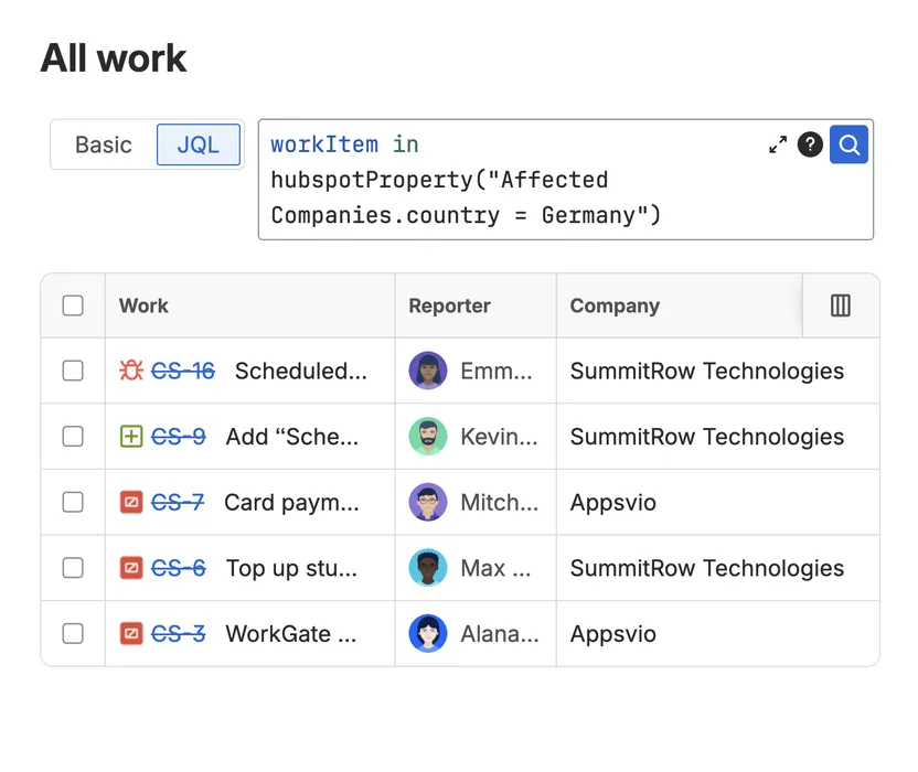 Teams know instantly which customers, companies, deals are affected. Triage work in Jira based on revenue, segment and urgency data from HubSpot.