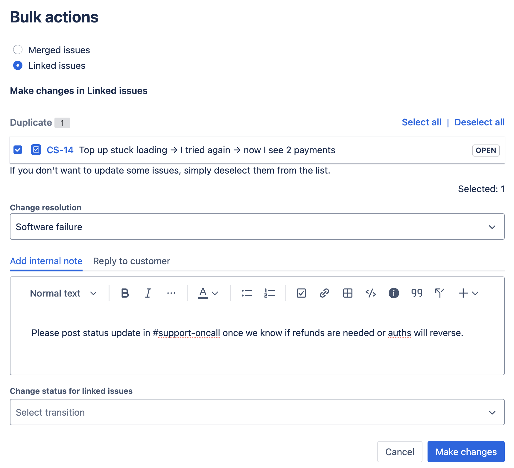 Clear Service Desk queues fast: use Jira bulk actions to post many comments, change statuses, update fields and link issues in a single action.