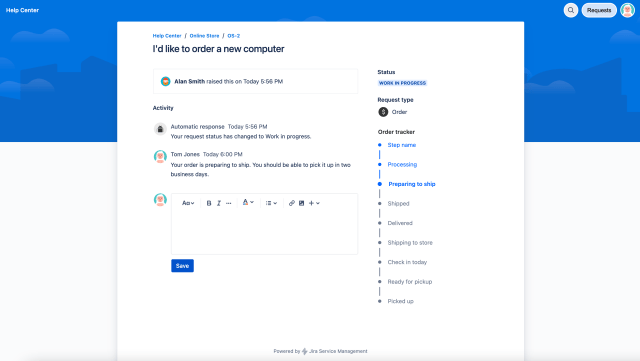 Consider Tom, a graphic designer ordering a laptop. Admin Greg configures request steps with clear names, color coding, and even automation that leaves public comments when a step changes. Tom logs into the portal and sees the full workflow, keeping him informed at each stage. That transparency leads to better communication, fewer questions, and happier users.