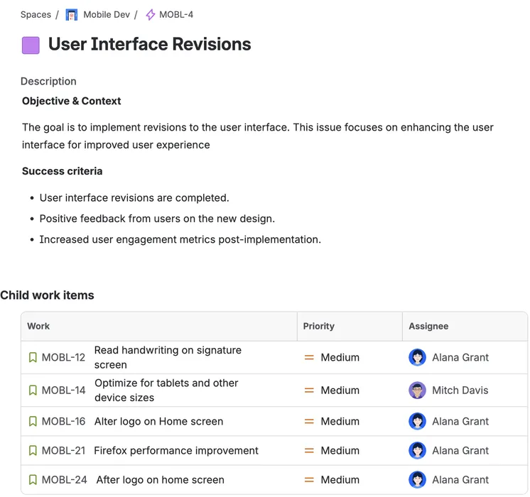 Apply templates directly on the Create screen or when adding child items, streamlining your team's native workflow.